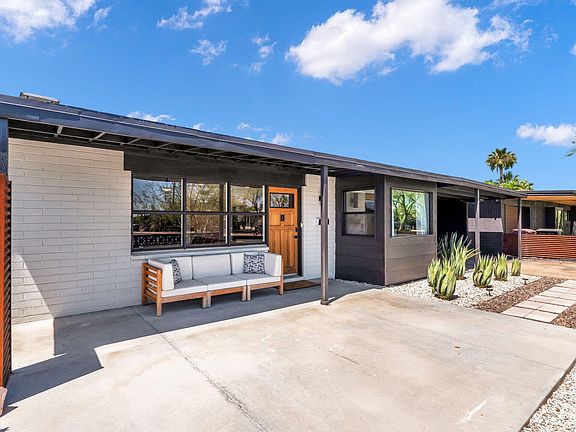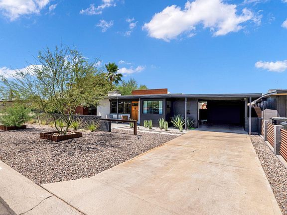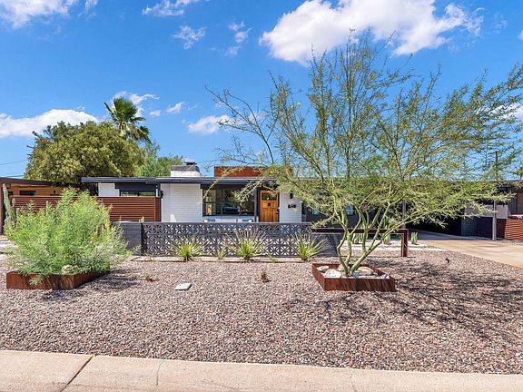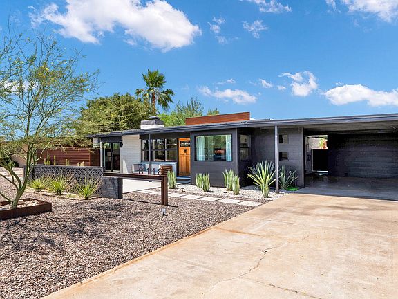 Fully remodeled 1950's mid-century modern home in South Scottsdale offers style, a comfortably spacious floor plan, all the modern amenities you're looking for and the original charm and integrity mid-century enthusiasts desire. Inside is an open floor plan flooded with natural light, warm wood floors and a refreshing cool color palette with a tasteful mix of white and black accents throughout. The kitchen was thoughtfully designed for the space with a large central island with marbleized quartz, black stainless gas cooktop/dishwasher and fixtures, open shelving and an abundance of storage including in the glass surround custom eat-in nook. The main living space is accented with an original open hearth fireplace updated with black shiplap, quartz and custom steel mantel. There are 2 generously sized bedrooms with full guest bath off the main living space, and a split primary suite with its own HVAC system, walk-in shower, large walk-in, custom closet and private patio. Outside is a deep 1.5 car carport off the main driveway with an electric vehicle charger, an additional paved parking pad, and generous indoor laundry room. The rear yard has been impeccably landscaped with extensive turf, lighting, shrubbery, a rubberized play pad with jungle gym, porcelain pavers surrounding a wood-burning fire pit for entertaining and an RV-gate with extended concrete pad for off-alley parking.