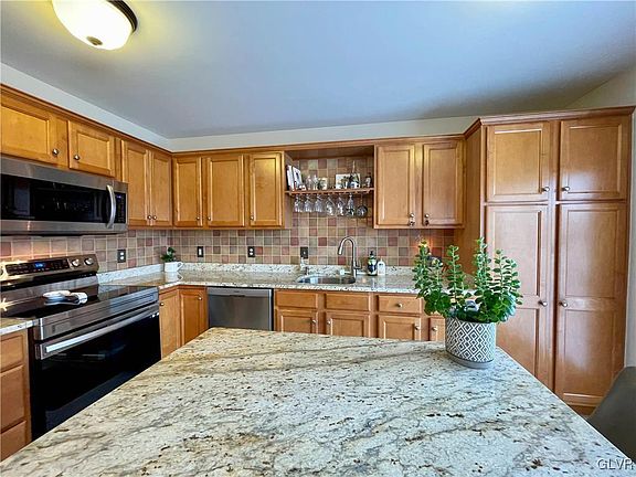 - Description: granite countertops and island, stainless steel appliances, sliding glass door with internal blinds