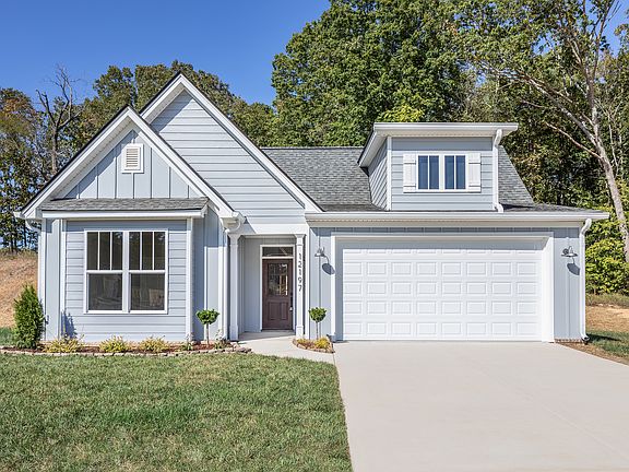 The Hunter's twin peak roofline and inset entry lend this one-level home a bright and stately curb appeal. The crossed-T configuration of the kitchen, living and dining room creates a moment of drama as you transition from the entryway to the openness of the main living areas. The floor plan incorporates other successful trends of modern plan design: a split-bedroom layout, a large kitchen preparation island, and a dining room framed by French doors opening onto a patio.