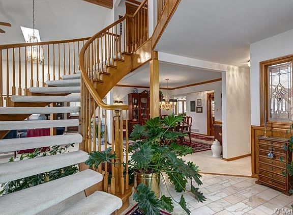 This home has a great open floor plan and features a dramatic curved floating staircase! The huge vaulted great room has 2 story ceilings, a wall of beautiful paneling, plenty of windows for natural light and brick faced vent less gas fireplace! The eat-in kitchen has lots of counter space, new stainless refrigerator, hardwood floors and an ample walk in pantry! In the formal dining room there is space for all of your furniture and a butler's pantry/wet bar for lots of extra storage! The main floor study has some built in shelving, and glass French doors. Upstairs there is a big master suite with a two sided fireplace, 5 piece bath and oversized walk in closet! The loft area has a baby grand piano tucked into the perfect spot and a bar/seating area with shelving and cabinetry! There are two more bedrooms that share a full bath. The basement is a full walk out with a garden level bedroom and a 5 non-conforming bedroom. There is a 3/4 bath, huge family/rec space, and lots of storage!