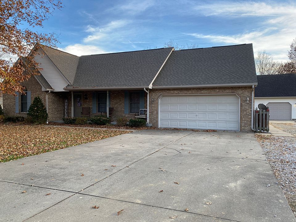 Oh HELLO...What a beautiful serene brick ranch on .72 acres. The entrance is graced by a covered front porch that welcomes you into a split bedroom open concept floor plan. Begin with 2 nice bedrooms with closets and beautiful windows that share a full bath with tub and shower. The living room is comforted by gas log fireplace with room for your large TV. French pattern tile dining room next to the kitchen with granite countertops and oak cabinets with pullouts. Private primary bedroom with two large walk in closets and double sink vanity, full tub with shower. The laundry is near by for easy access. Then step into the beautiful glass sunroom with wood vaulted and beam ceilings and fans. Sliding doors will take you out to a fenced lawn with concrete patio areas and a long gas stone fire pit. There is an attached 2 car garage with utility closet and storage. A heated 30 x 30 detached garage and workshop with dual overhead doors and a covered porch with swing. Get your showing scheduled today.