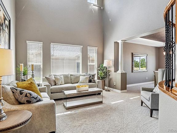 Welcome to this outstanding Blackstone home with HUGE Rocky Mountain views! A lovely, covered front porch greets you as you walk up to the front door - perfect for enjoying your morning coffee while watching the sun rise. A living room with cathedral ceiling and a formal dining room big enough to accommodate a large table and buffet are adjacent to the kitchen - imagine the holiday and birthday parties you could host in this home! The kitchen is just stunning with its abundant 42- inch cabinets topped with crown molding, ample granite countertops, all stainless appliances, 2-level island for additional prep space or informal dining, and a cozy breakfast nook that overlooks the backyard! Family room features high ceilings, a gas fireplace with charming mantle. Don't miss the main floor study - great as a home office or quiet homework area! The upper level is accessed by an elegant staircase with wood rails and wrought iron spindles! WOW- Master bedroom is enormous, boasting vaulted ceilings, a gas fireplace with custom mantle, a sitting area, and a luxurious 5- piece bath with His and Hers vanities, jetted soaking tub, oversized glass shower, and a big walk-in closet! Bedroom #2 has a private 3/4 bath (great for guests!), bedrooms 3 and 4 share a Jack and Jill bath with double vanities and a private bathtub area! You will love hanging out with friends and family in the finished walkout basement! The rec room features a full wet bar with dishwasher, wine fridge, and keg! Some extra special features include NEW finished concrete flooring, Pella blinds, surround sound, and powder bath! Step out to the stamped concrete patio with elegant water feature, firepit and enjoy gorgeous Colorado sunsets and mountain views! Don't miss the spiral staircase up to the covered patio! Conveniently located near E-470, grocery stores, and Southlands outdoor shopping mall and restaurants! Come visit this remarkable home!