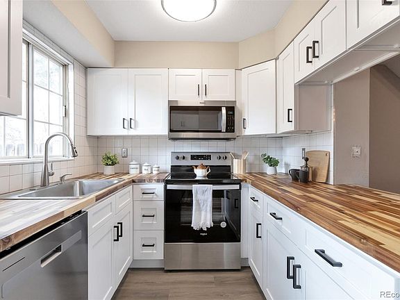 END UNIT townhome with attached garage in the lovely Highland View community! This amazing property has been fully renovated and will appeal to even the pickiest Buyer. This home is freshly outfitted with new luxury vinyl plank flooring throughout, all new kitchen cabinetry, new appliances, new countertops and backsplash, new vanities, new light fixtures, and a brand new HVAC system. On the main level, you'll find an all new kitchen, dining area, powder (1/2) bathroom, and comfortable living space. The upstairs (also freshly remodeled) features two bedrooms with the east-facing Primary attached to the full bathroom. Don't miss the detail work in the bathrooms which are beautifully wallpapered and the kitchen with a counter to ceiling backsplash. The lower (garage) level has space for one vehicle and is also where you'll find the washer and dryer. Backing to the community open space, this townhome is also just steps away from the pool and is conveniently located near restaurants, shopping, groceries, and other amenities. Get ready to fall in love with your new home!