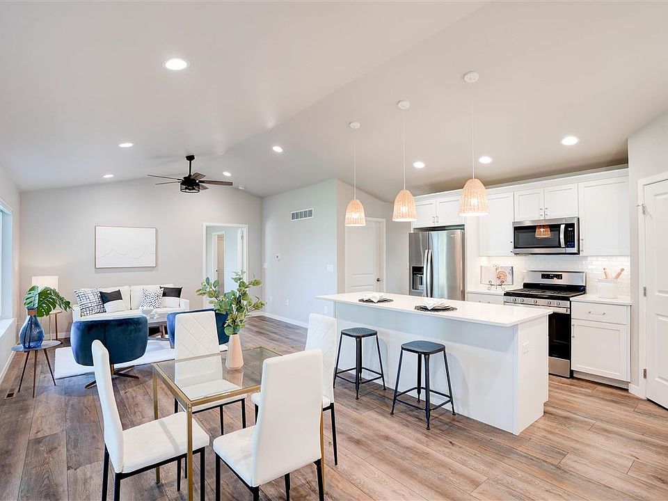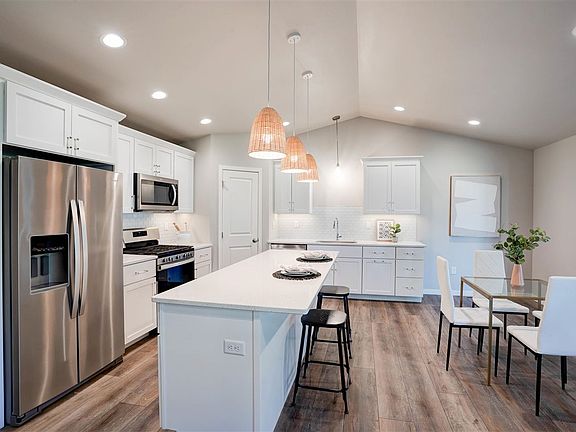 Stylish 4 bedroom, 3 bath, zero entry ranch built in 2021 by MAS Construction. Spacious and open floor plan with vaulted ceilings lets in lots of natural light. Gorgeous kitchen with sparkling quartz countertops, great walk-in pantry and large island with seating, storage and prep space. Admire the beautiful sunsets from the sunroom that walks out to a maintenance free deck overlooking the large backyard. The spacious master suite boasts a walk-in closet and private master bath with walk-in shower. Also on the main floor are a second bedroom, full bathroom with tub, and laundry room with matching Electrolux front load washer and dryer. On the lower level you will find a bright family room, two more bedrooms, a full bath with shower, utility room and large storage room. Extra deep 2 car garage has plenty of room to add shelving. Located in new Valley View development not far from the vibrant and growing downtown Kalona, Kalona City Park, Mid-Prairie East Elementary and Middle School.