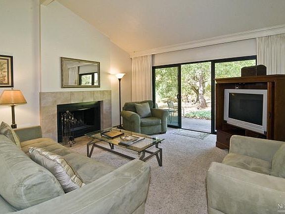 Relax, Enjoy and Experience! Resort living at prestigious Silverado Country Club. Single level end unit surrounded by beautiful oak trees, redwood trees and lovely landscaping. This condo is open and bright. Spacious living room with cathedral ceilings, fireplace and sliding door opening to patio and nature setting. Gated entrance and community pools and tennis courts for exclusive use by owners.