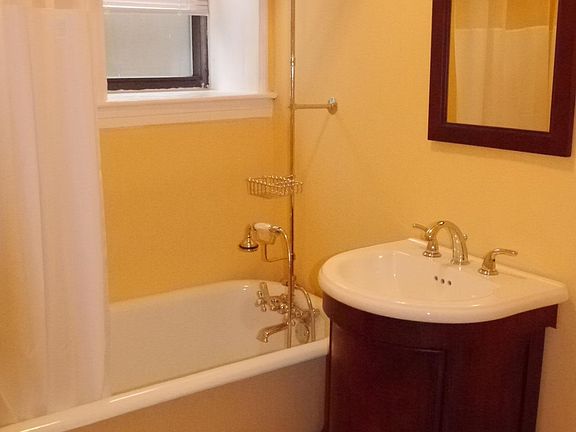 No fee. Beautiful, lovingly restored 1927 Prewar elevator apartment house. 4 Room apartment includes spacious kitchen, 2 bedrooms, living room with French doors, cool bathroom with claw-foot tub and cherry sink base. Fresh paint, nice flooring, on lower level with easy access to laundry room, no-stairs entry and exit, plenty of windows. Building is located close to parks, shops, houses of worship, schools, public transit and lite rail. Sorry, no pets. Rent includes heat and hot water. Super is attentive and responsive. Management is accessible and caring.
