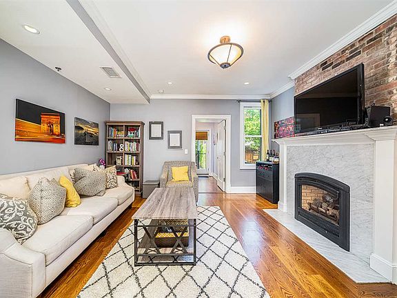Past an expertly restored brick facade and Moroccan inspired foyer lies a brilliant backyard oasis and gorgeous renovation on Bloomfield Street. A smart & stylish 1 bed + home office/den with deck and landscaped garden, this home has it all. Open chef's kitchen features SS appliances, contemporary oak cabinetry, hammered black granite counters and custom tile backsplash. Ample living room offers exposed brick, recessed lighting, hardwood floors and gas fireplace with handsome marble surround. Master bed and bright home office/den with glass door to garden features high ceilings, crown molding and excellent closet space. Indulgent bath shines with glass mosaic tile, marble vanity & extra deep soaking tub. All this plus CAC, smart-home security system, smart thermostat, in-home laundry and storage shed in the garden. Recently reduced property taxes, great capital reserves and located on one of the most desirable blocks in town, outside the flood zone, with easy access to Hoboken's best: world-class shopping, dining and entertainment, one of THE most dramatic waterfronts, and easy transport into NYC via Path, bus or ferry. Rental parking available nearby.