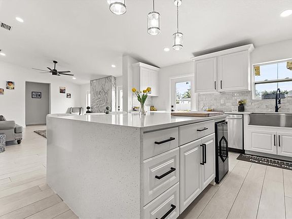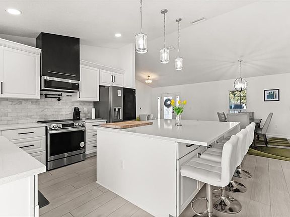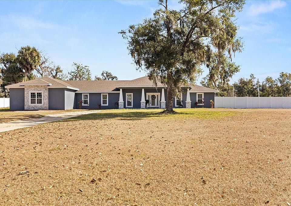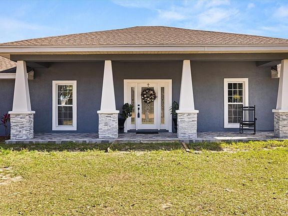 Welcome to your private oasis! From the welcoming front porch, with rock enhanced columns, through the lead glass door, you will be wowed by this extensively remodeled 5-bedroom, 5-bath home. The gourmet kitchen is both beautiful and functional boasting quartz countertops, 42'' cabinetry, a deep farmhouse sink, stainless-steel appliances, cooktop with vented hood and a large center island perfect for casual dining or holiday gatherings. The bright, open floor plan connects seamlessly to the dining area and two spacious living areas—ideal for both everyday living and entertaining. Enjoy the electric fireplace set against a wall of marble tile accented by beautiful tile floors and vaulted ceilings. The primary suite is a retreat unto itself, with plenty of room to create a sitting area, and a walk-in closet with custom built-ins. The spa-style primary bath features a soaking-tub, walk-in marble tile shower and the double vanities offer ample counter space. A 2nd en-suite would be ideal for a guest suite or in-law suite. Step outside to discover a partially fenced backyard with plenty of lawn space for gardening, play, or al fresco dining. Modern mechanicals include NEW HVAC, roof, septic and well systems. The 3-car side-entry garage offers plenty of storage space as well. The home sits on a generous 1.33 acre parcel with no HOA or CDD fees, even having a peek-a-boo view of Lake Weeks. Located just minutes from numerous parks, schools, shops and restaurants, this home delivers luxury, functionality, and unbeatable value. Come see it today!
