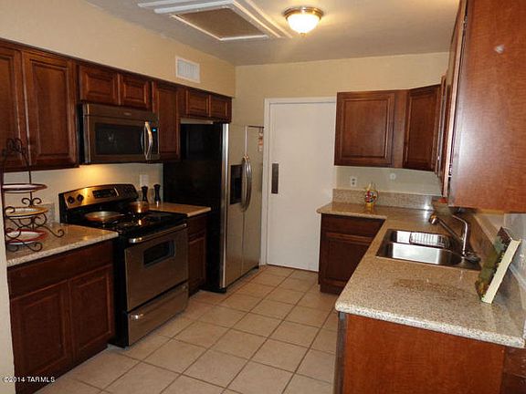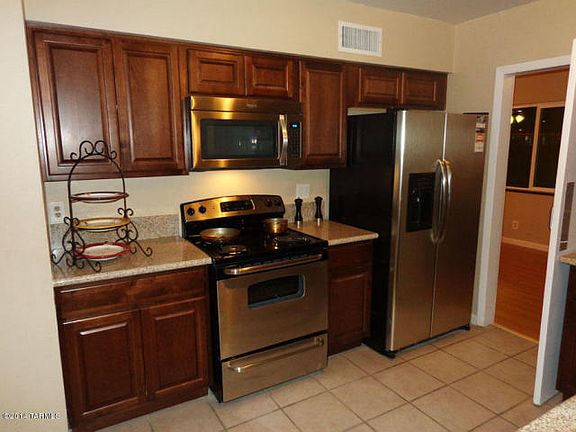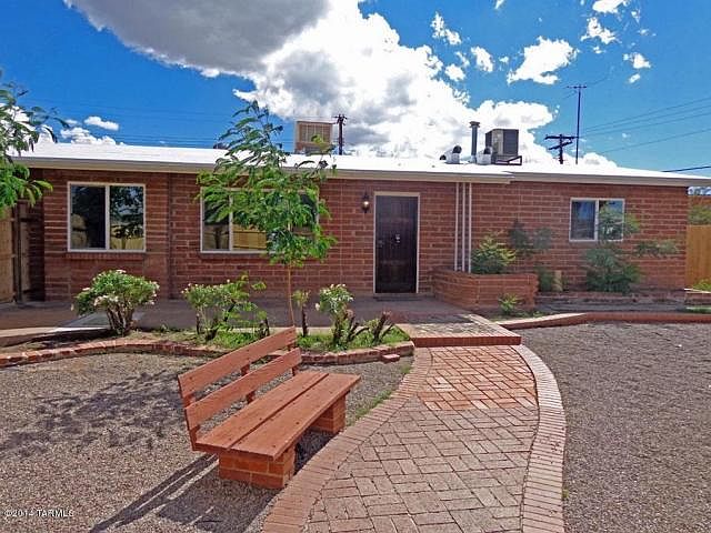 Beautiful remodeled 3 BR, 2 BA central Burnt Adobe home with privately fenced front and back yards. Very comfortable and ''turn key'' ready! Freshly painted interior with new chrome kitchen appliances, Granite Counters, new cabinets, sink & fixtures. A large full bath with new sink, cabinet and newly tiled shower/tub. A 3/4 bath with new shower, sink & fixtures is accessible via the master bedroom and the kitchen. Beautiful new floating wood flooring, new dual pane windows and newer sliding glass door to patio. A newer water line to street and newer water lines throughout home. Roof recoated with 2 year warranty. Enjoy an awesome view of Catalina Mountains / Table Mountain from your Great Room and front enclosed yard. Chain link fence on east side in shrub growth. Rear storage shed remain