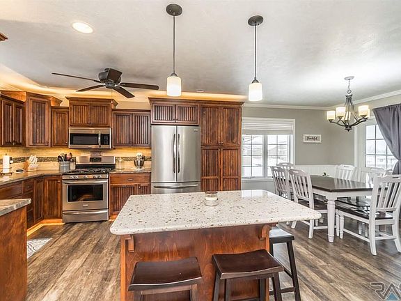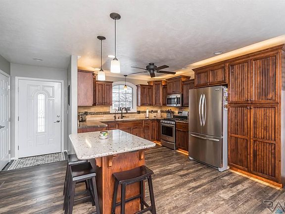 Ranch walkout home in the heart of Garretson! This 5 bedroom, 3 bath home has a 3 stall garage that is insulated, sheet rocked, heated, and has a floor drain. The main level has a great layout, featuring main floor laundry, and 2 bedrooms, 2 baths including the master suite with updated ¾ bath, and large walk-in closet. The kitchen has been completely remodeled in 2015, with custom birch cabinets, an island for extra counter space, and under cabinet lighting. The dining is just off of the kitchen, and walks out to the covered deck. The walkout lower level features a huge family room, 3 bedrooms and a full bath. The lower level has all new flooring and has great natural light. The backyard features an awesome play area with a Rainbow Play system, sandbox, and outdoor faucet for play and clean up. This home also has central vac, surveillance system, multiple smart switches throughout and lots of electrical upgrades throughout! Close to ball fields and pool!