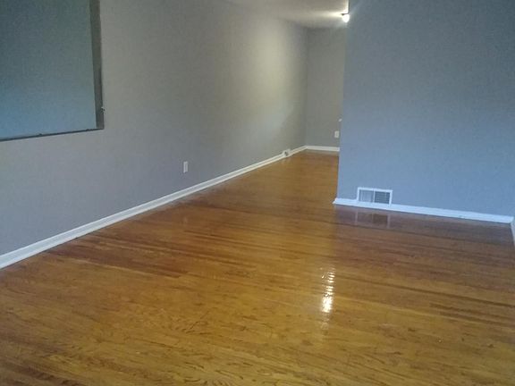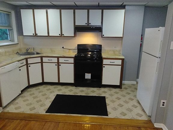 Living Room and Dining Room have hardwood floors. Open floor plan. Large kitchen with dishwasher and refrigerator. Half finished basement for possible office or bedroom. Washer and dryer. Also has central air. 1 car garage. NO PETS. Tenant pays all utilities