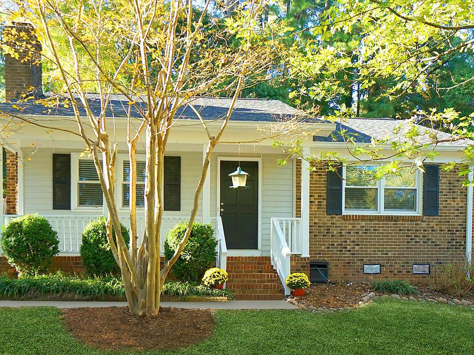 Updated North Raleigh RANCH on a quiet cul-de-sac — truly like new. Charming concrete rocking-chair porch with brick steps on a private, established lot in a prime location just minutes to shopping, dining, I-540 and RDU. Major recent improvements include New HVAC (2025), New Roof, New Deck, New Windows in (2020) The kitchen overlooks the fenced backyard and features updated wood cabinetry, granite countertops, subway tile backsplash and tile floors — a fresh, clean, modern look. Real hardwood floors carry through all main living areas and bedrooms. The spacious family room offers a fireplace with a modern mantel and updated fan. The primary suite includes hardwood flooring and his-and-her closets. The updated bath offers a stylish vanity, tiled floors, and current finishes. A separate laundry room completes the home. Turn-key, one-level living in a high-demand North Raleigh location —Walk to shopping and dining!