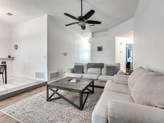 Nestled in the Eagle Cliff neighborhood of Norman, OK, this charming home features three bedrooms and two bathrooms. It offers a two-car garage equipped with a storm shelter, providing peace of mind during severe weather. The property boasts a large backyard adorned with mature trees, perfect for outdoor activities and relaxation. Inside, the living room is inviting with a cozy fireplace flanked by windows that flood the space with natural light. The kitchen is well-appointed with built-in appliances and includes a breakfast bar for additional seating. The master bedroom is a serene retreat with a tray ceiling, updated ceiling fan and walk in closet. The home’s interior is elegantly styled, with beautifully painted gray woodwork and light-colored walls that create a bright and airy ambiance.
