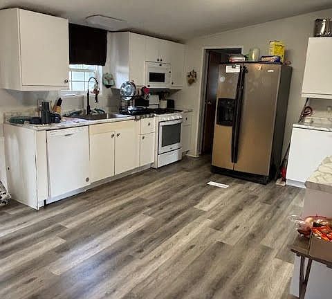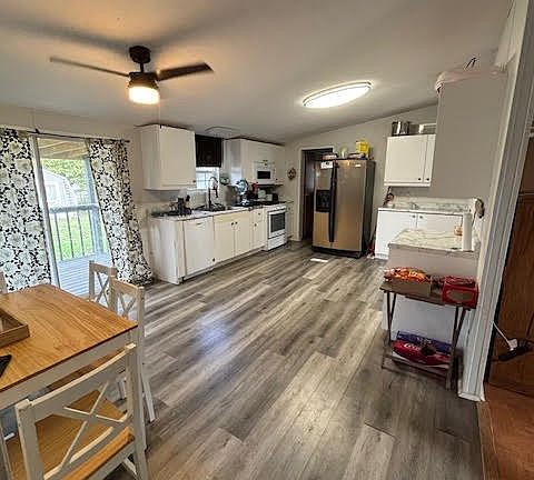 Updated in 2023 this 3BR 2BA manufactured homes welcomes you with an open concept floor plan.  The eat-in kitchen features new flooring, appliances, countertops and fixtures along with ample cabinet space.  The Master bath offers a walk-in shower, new vanity and toilet plus a storage area.   Included in the update were the roof (10/2023), new plumbing, 200 amp service, water heater & more.  The fenced in backyard, covered deck & firepit are a great addition for enjoying these cool autumn evenings.    Schedule your appointment to view this affordable, move-in ready home today!
