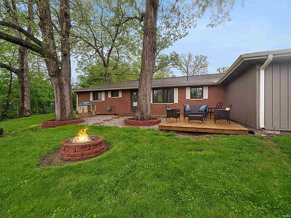 Welcome home to this move-in ready all brick ranch boasting a covered front porch, split bedroom floor plan, large fenced back yard & heated garage on a quiet cul de sac! Plus, it’s walking distance to town without feeling like you’re in town—the best of both worlds! Located in peaceful area just off IN-13 & tucked away at end of road on magnificent 0.58 acre lot with many tall trees offering both shade & privacy, this 4 bedroom, 2.5 bath home has been well maintained from outside in with obvious pride of ownership. Built to last in 1965, it retains some hallmark elements of the period with excellent quality craftsmanship alongside some aesthetically pleasing updates. Classic yet attractive exterior presents curb appeal with detailed landscaping, attached 2 car garage & inviting porch where you can chat with friends. Front door opens to bright & welcoming atmosphere complemented by gorgeous hardwood floors after the tiled entry. Cozy front living room is open to the adjoining dining nook underneath ceiling fan with back yard views. Dining is beside galley style kitchen with a sizable family room at opposite end. Kitchen has everything you need with abundant cabinetry, tile backsplash that matches the tile floor & recessed lighting. Generous primary bedroom includes en suite bath with modern vanity, medicine cabinet mirror & tub/shower combo. Remaining 3 bedrooms are all comfortably sized (with ample storage throughout) & in hallway beside main shared bath also with updated vanity & tub/shower combo. One of the bedrooms connects to a little half bath with 2 entry points & opens to the laundry/utility hallway with door to back yard. Step out to the spectacular back patio with ultra private feel due to the positioning & vegetation—it truly is your own private oasis! Wooden deck is ideal for dining al fresco or simply kicking back & relaxing as your survey your realm. In ground fire pit is perfect for burning leaves or roasting marshmallows with a free standing shed for easy access to yard tools & toys. Yard is completely enclosed with plenty of space for all kinds of outdoor fun & activities. Walking distance to favorite local amenities such as Maria’s House of Pancakes, Lucky’s Tavern, The River Coffeehouse—even the public beach area next to the Dixie Boat! Are you ready to have your best summer yet from your new home? Don't let this one slip away—reach out today!
