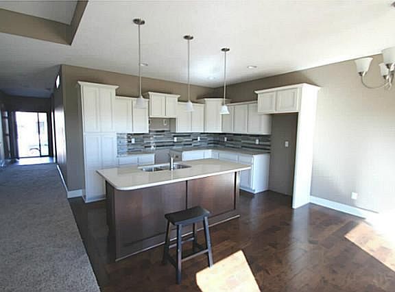 Classic Builders Madison ranch plan with approx. 2,404 sq. ft. of quality finish, 4 bedrooms, 3 full bathrooms and 3 car attached garage. The exterior offers stone detailing, maintenance free vinyl siding and front porch. This home enters into a long hallway with 2 bedrooms, full bath, mudroom/laundry room with lockers and opens up to reveal the spacious family room with fireplace. Modern, open kitchen with granite countertops, tile backsplash, island/breakfast bar and hardwood flooring that ext
