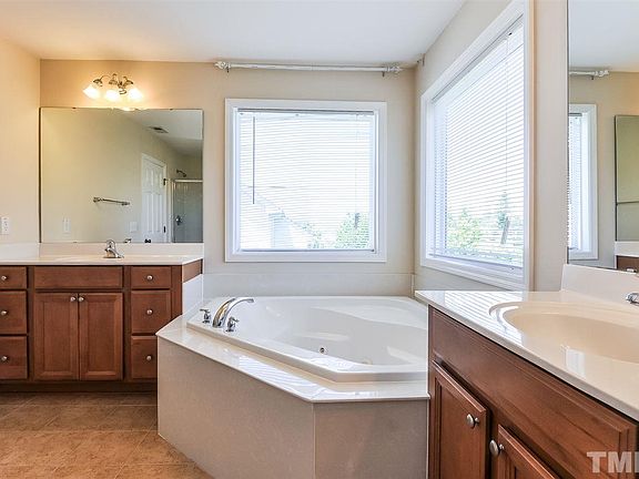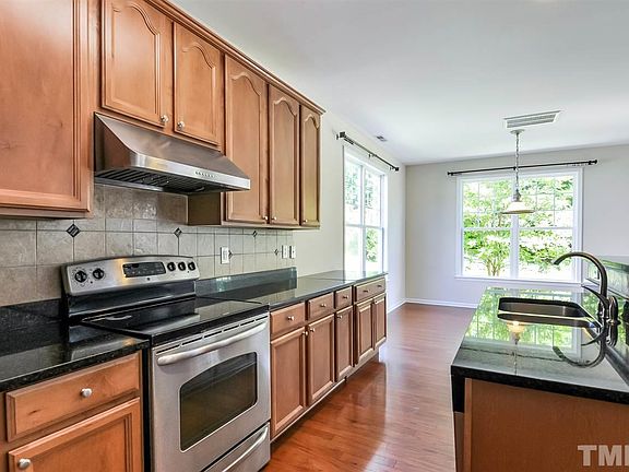 This Cary two-story home offers hardwood flooring, a gas fireplace, stainless steel appliances, granite kitchen countertops, and a two-car garage. Upgraded features include fresh interior paint.