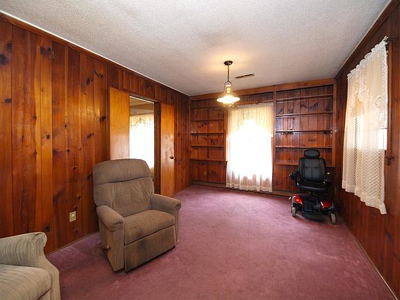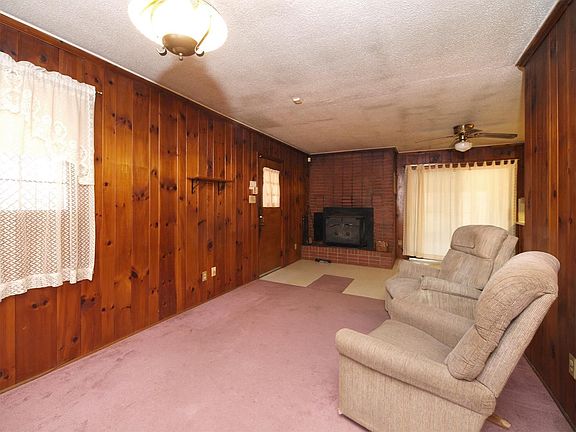 So much potential in this brick ranch on 1.5 acres! Living Room and Den area. Kitchen has cooktop, ample cabinet space and wall oven. Large BRs. Spacious sunroom and covered patio offer plenty of space for relaxing or entertaining. Private wooded lot! Must see! Appliances and wood stove are negotiable. Sold As-iS.