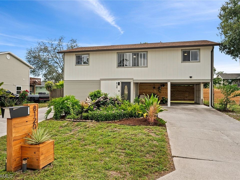Welcome to your dream home in San Carlos Park! This beautiful, freshly painted home offers 3 beds, 2 baths, over 1100 SQ FT & has the perfect combination of modern updates and traditional charm. The first thing you’ll notice when you enter the home is the beautifully tiled foyer (that opens to utility closet w/ full size W/D) & stairway that leads to you primary living space. The kitchen has been fully remodeled with sleek, stainless steel appliances, granite countertops, and new cabinetry. The bathrooms have also been updated to include new fixtures, shower tile, flooring and stylish finishes. The living room features plenty of natural light and easy access to your large deck overlooking the lusciously landscaped, fully fenced backyard. The master suite is light and bright w/ neutral hues making it a calming retreat. The fully updated master bath is well appointed w/ a barn door entry. A split plan, your guests will appreciate the privacy of your new home. Incredible outdoor living w/ large, updated deck & under your home there's even more room to entertain. Huge storage closet in the lower level for yard equipment, etc. Close to GCTC, FGCU, and all that SWFL has to offer!