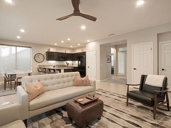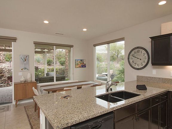 This unique Maurea includes a custom room addition and is located on an extra-large lot with several outdoor entertaining possibilities. Entering the front door, you see beyond the great room through to the awesome back yard. The kitchen features slab granite countertops, refinished mocha cabinetry, a large pantry, a breakfast bar and a more formal dining area too. The master retreat features a spacious walk-in closet, a second closet, and an ensuite bath with dual vanities. For maximum privacy it's located a distance from the guest area that features a second bedroom and a Jack & Jill bathroom that is shared with the added room. An oversized 2 car garage and separate laundry room are also included. The low maintenance back yard has interlocking pavers, a Zen-like fountain and a large alumawood pergola with fans and mood lighting where you can sit and enjoy quiet moments, or you can gather around a fire ring for an intimate chat. There is also a large area landscaped with maintenance free artificial turf where you can just sit and relax. Additional amenities include upgraded tile floors in the living areas, plush new carpet in the two original bedrooms, shutters and custom window shades, LED recessed lighting throughout, newly painted interior, recently added lighting in the front and back yards and so much more. It's located near the Clubhouse and all the amenities Trilogy, has to offer. It's truly a gem to be enjoyed as a winter getaway or as a year around home