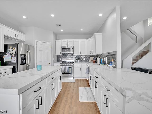 - Description: Breakfast Bar/Counter,Custom Cabinets,Island,Lighting Recessed,Man Made Woodor Laminate Flooring,Quartz Countertops,Stainless Steel Appliances,Walk-in Pantry