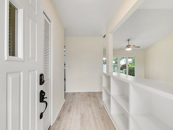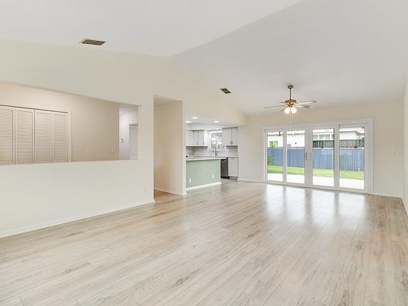 Completely Remodeled & Move-In Ready! This Light & Bright 3 bedroom, 2 bath home offers modern coastal living just 3.7 miles from Hobe Sound Beach and Downtown. Step inside through the covered entry to find an open floor plan filled with natural light, new light wood laminate flooring, and a spacious living/dining area that flows seamlessly to the outdoors. The fully remodeled kitchen boasts Quartz countertops and backsplash, Shaker-style cabinetry, stainless steel appliances, and a large island with seating perfect for entertaining. Both bathrooms have been beautifully updated with wood vanities, tile flooring, and lighted fog-free mirrors. Enjoy indoor-outdoor living with impact sliding glass doors leading to a private, fenced backyard with tropical landscaping and generous patio space. Key upgrades include: 2024 metal roof, 2025 garage door, impact windows and sliders, hurricane shutters for additional protection, and NO HOA! Minutes from boat ramps, parks, restaurants, and everything Hobe Sound has to offerdon't miss this opportunity!