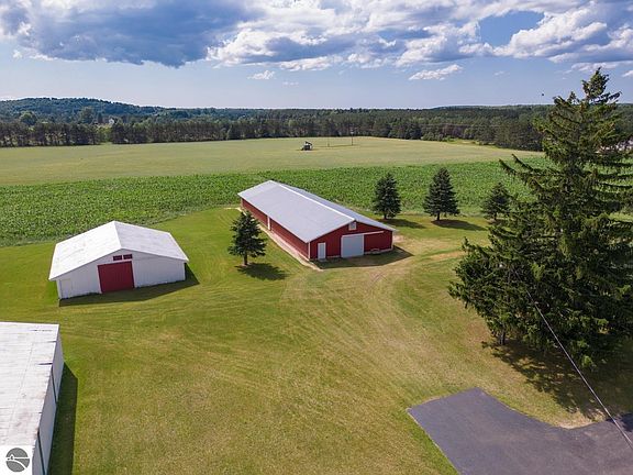 Farm w/ 3bd/2 bath ranch home and 3 barns on 50 plus acres conveniently located off 131 with M-66 and Scholl road access. The home has 3 main floor bedrooms and is just under 1700 sq ft. The finished basement has additional kitchen and laundry. There is plenty of room to entertain inside, or outside on the expansive wrap around deck and spacious yard. If you are looking to develop a property, this will be the perfect place for you. The 3 barns give adequate storage for your equipment, rental space or many other options. The Large Red barn estimates 4,442 sq ft. and could make a special place as a wedding venue. The 40 X 120 barn is fully insulated with electric, partial concrete floor and drive through slider doors on each end. The 40 X 45 barn has slider entry and exit as well. Approx. 40 acres of income-producing tillable ground. (Last year was corn)There are endless opportunities to develop this property of over 50 acres. All information to be verified by buyer.