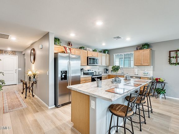 Assumable Loan! Meticulously maintained home in the gated community of Northern Ridge Estates! This 3 bed, 2 bath home boasts light wood-look tile flooring throughout & a neutral color pallet. The open living area features a sleek kitchen with stainless steel appliances, island, & convenient walk-in pantry. Enjoy privacy with the split floor plan & unwind in the primary suite with ensuite bathroom. Also featured, a laundry room with built-in cabinetry & a 2-car garage. Backing to Northern Ave, you'll love living in this ultra-private community with convenient access to Tanger Outlets, Westgate Entertainment District, State Farm Stadium, shopping, dining, & more - the options are endless!