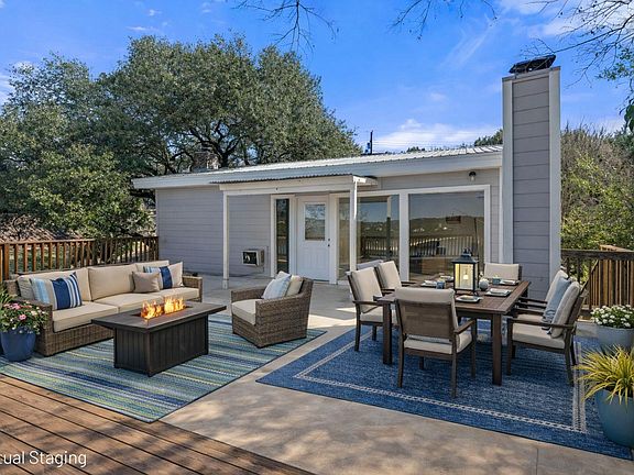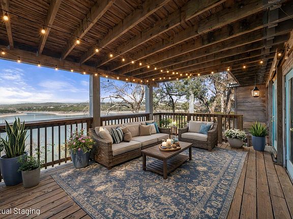This deep-water Lake Travis property in Volente offers main-body waterfront, incredible lake views, and one of the best values currently available at its price point. With deep-water frontage, the property is well positioned for a future dock while already providing shoreline access. Elevated above the lake, the home captures sweeping lake views and year-round usability. The home will convey with newly purchased furnishings, allowing buyers to enjoy the property immediately or update at their own pace. Well suited for use as a private lake house or a short-term rental. The floor plan includes two bedrooms plus a study and three full bathrooms, with an open main level featuring a spacious kitchen, dining area, multiple living spaces and access to two expansive decks that extend the living space outdoors. The upper-level bedroom enjoys stunning lake views, private deck access, and a dedicated bath and study. Located in a quiet waterfront neighborhood with a single point of entry, the setting feels private while remaining highly convenient—just 10 minutes to Four Points (620 & 2222) for shopping, dining, and entertainment, and approximately 30 minutes to downtown Austin. The property is zoned to highly rated schools, including Grandview Hills, Four Points Middle, and Vandegrift High School, and is close to local favorites such as Volente Beach Club, Beachside Billy’s, Shack 512, Stiechen Park, and a nearby fire station. Offering deep water, main-lake access, panoramic views, and immediate usability, this property stands out as a rare opportunity on Lake Travis—priced at lot value and ready to enjoy from day one.