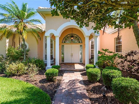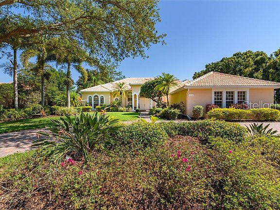 Have you dreamed of living on the water, watching golfers in the distance, in a beautiful gated community? You may have found your new home in University Park Country Club! Seldom on market a Regents Court home built by the Morton Brothers - roof replaced in April, pavered circular driveway, and 3 car side entry garage. As you approach the double doored entry you will be awed by the stained-glass surround opening to a light filled home wrapping around a horizontally installed heated pool and spa. The home has been well maintained combining the traditional with contemporary elements throughout. The living/dining room complete with outstanding views of the water and golf, kitchen has granite, pendant lights, white cabinetry, pantry and a desk area so convenient for bill paying or jotting notes! The family room is a true bonus with contemporary wall installed electric fireplace providing superb ambiance. If you have been seeking a true 4-bedroom home with a wonderful master bedroom suite with extra relaxation area or office and you may have found your new residence-definitely worth a look! Isn't it time you begin living the University Country Club lifestyle with 27 holes of championship golf, Har-Tru Tennis Courts, a game of croquet, exercising in the State-of-the-Art Fitness Center, and the great dining venue? Close to the UTC and all the cultural events of Sarasota. This is the dream! (Possibly turnkey furnished including golf cart)