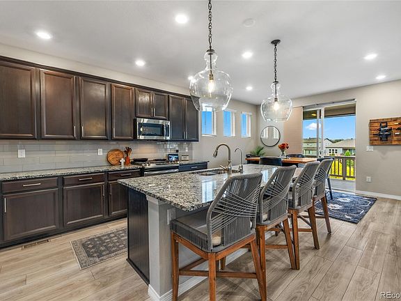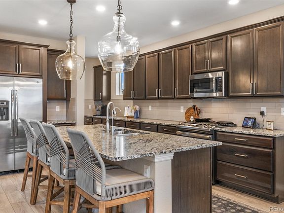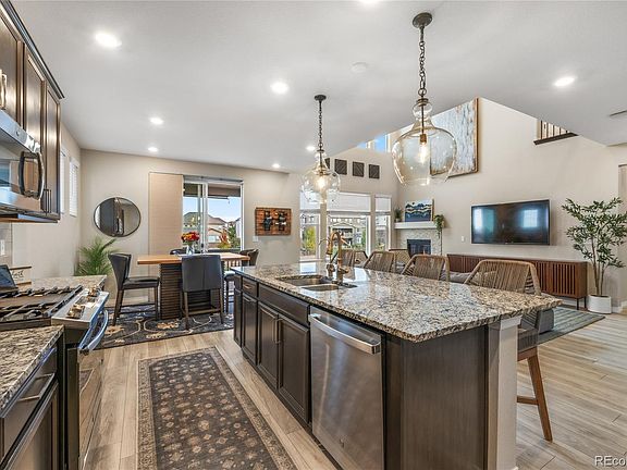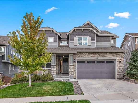 Welcome to this stunning 5-bedroom, 4-bath home in the highly sought-after Whispering Pines community. Backing to open space, this two-story home blends everyday comfort with thoughtful design. The main level welcomes you with a vaulted entry and a bright, open layout. Off the front door, there’s a private office—perfect for working from home. The kitchen offers granite countertops, rich dark cabinetry, and a walk-in pantry, flowing easily into the living room with an electric fireplace. Step outside to a spacious deck that overlooks peaceful open space—an ideal spot for entertaining or simply relaxing at the end of the day. Also on the main floor is a guest bedroom and full bath, plus a convenient mudroom right off the garage. Upstairs, brand-new carpet (October 2025) runs throughout. The primary suite feels like a retreat with its double sinks, glass shower, and oversized walk-in closet. Two additional bedrooms, a full guest bath, and a loft provide plenty of extra living space—perfect for a playroom, media area, or lounge. The finished walk-out basement is where this home truly shines. Designed for versatility, it could serve as a full guest suite or entertainment space. Over $100K in upgrades include a gorgeous full kitchen with quartz countertops, blue cabinetry, and open shelving. Large sliding doors open to the patio, extending your living space outdoors. The lower-level bathroom was fully renovated with double sinks, a large soaking tub, and a glass-enclosed shower. There’s also an additional bedroom and flex area ideal for a gym, game room, or home theater. Located close to parks, trails, shopping, and E-470, this home offers both convenience and tranquility. Backing to open space, you’ll love the peaceful setting and easy access to evening walks and quiet nights under the stars.