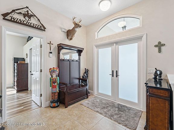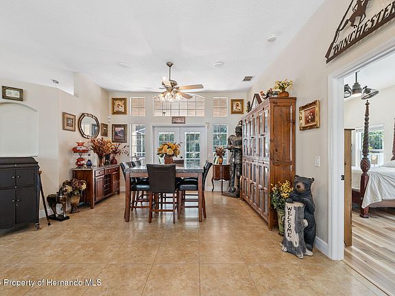 Nestled at the end of a quiet cul-de-sac, this well-kept 3-bedroom, 2-bathroom home with a 3-car garage backs onto a lush conservation area, providing a rare blend of privacy, greenery, and peaceful surroundings. A manicured front lawn and charming covered porch set the stage as you approach the double entry doors, which feature frosted glass panels that offer both elegance and added privacy while softly diffusing light into the foyer. Inside, ceramic tile flooring flows through the main living areas, complemented by 10-foot ceilings throughout that create a spacious, open feel. The front entry opens to a versatile space currently used as a formal dining room, while to the left, a secondary living area with a picture window overlooking the front yard adds flexibility and comfort. Straight ahead, the main living room is filled with natural light from a wall of windows and French doors that open to the serene outdoor space. To the right of the foyer, the private primary suite features luxury vinyl plank (LVP) flooring, abundant windows, its own French door to the lanai, two large walk-in closets, and an ensuite bathroom with a granite-topped vanity, rich wood cabinetry, a step-in shower, soaking tub, built-in shelf, and a private toilet room. The kitchen offers granite countertops, real wood cabinets, stainless steel appliances, a gas range, water softener, a second refrigerator in the garage, a breakfast nook, and a breakfast bar framed by floor-to-ceiling windows overlooking the pool area. The kitchen flows seamlessly into the sunlit family room, where two sliding glass doors and a large window bring in beautiful natural light. The home follows a true split plan, with two additional bedrooms on the opposite side—each with built-in closets and overhead storage—and a full bathroom featuring granite counters, wood cabinets, and a tub/shower combo. All bedrooms are finished with LVP flooring for durability and style. The laundry room is spacious and includes cabinetry, counter space, and a separate pantry for additional storage. Recent upgrades include hurricane-rated windows and doors, LED lighting, a new counter-depth refrigerator, Bluetooth speakers in both bathrooms, and an epoxy-coated garage floor. The lanai is also equipped with hurricane-rated mesh screens for added storm protection. Outside, a large covered lanai with tongue-and-groove wood ceiling opens to a screened-in pool and elevated deck that overlooks the tranquil conservation area—creating the feel of a peaceful mountain retreat. Step down to a lower paver patio with a built-in fire pit, perfect for cozy evenings under the stars. The backyard is fully enclosed with a vinyl privacy fence, ideal for pets or entertaining. Located just 9 miles from the Suncoast Expressway, the home offers easy access to Tampa, the airport, and nearby attractions like Sims Park in downtown New Port Richey (5.5 miles), Jay B. Starkey Wilderness Park (8 miles), and Robert K. Rees Memorial Park and Beach (9 miles), where you can enjoy boardwalks, wildlife, festivals, and sunsets by the Gulf. This home blends comfort, quality upgrades, and natural beauty in a truly special setting.