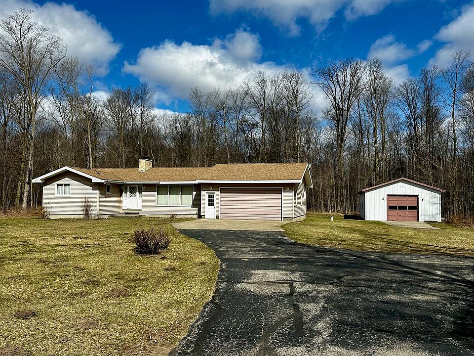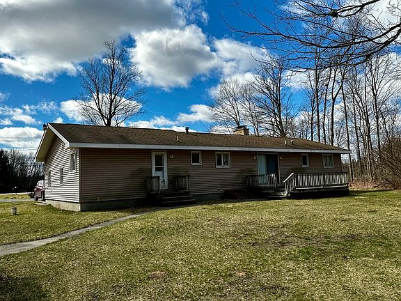 3 Bdrm, 2 1/2 Bath, 1,465+- sq.ft., Ranch style home on nearly 10 acres, just outside of Hesperia. Offers a wood deck, fireplace(s), partially finished basement, attached garage, and 24'x 40'+- heated pole barn. Immediate possession at closing, ready to update to buyer's taste.