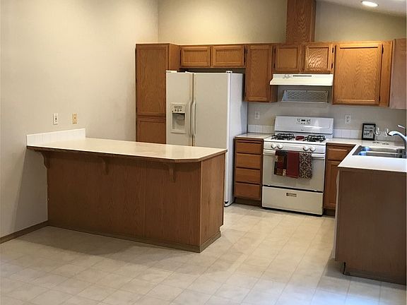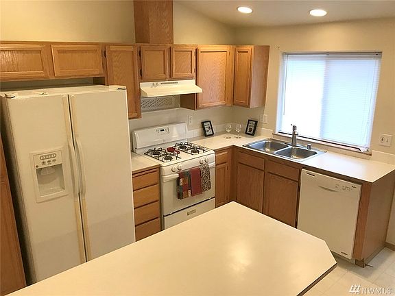 Wonderful four bedroom, two bath home with everything you need! Light, bright open home with vaulted ceiling and skylight in living room, big windows and vaulted ceiling in huge kitchen with breakfast peninsula. All kitchen appliances included. Master with private bath and walk in closet. Separate laundry/mud room from extra tall two car garage, great for storage. Fenced back yard opens to green space and community park. Vinyl siding for easy maintenance. Community playground nearby.