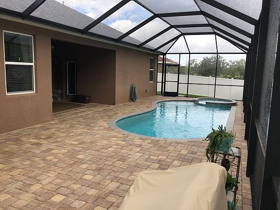 Beautiful move in ready 4 bedroom, 3 bathroom home in Copperstone's gated Community. Entry opens to large living room with 2 tone paint and tile flooring. Kitchen features pantry, stainless steel appliances, pantry, breakfast bar, breakfast nook plus granite counter tops. Laundry room off to side of kitchen. Master bedroom with large walk in closet and en-suite bathroom with granite counters, dual sinks, and garden tub. Tiled family/dining room opens to covered screened pool area with hot tub and fenced backyard. Plenty of room for entertaining or just relaxing. You are going to love this home.