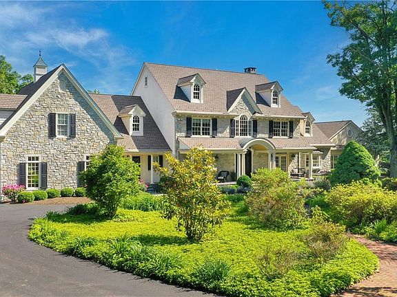 Set on an enchanting 30 acres, down a winding driveway bordered by tall trees and nicely removed from a quiet country road in Upper Bucks County, sits Four Seasons Manor. This stately custom home is designed to take full advantage of its surroundings, with almost 10,000 finished square feet inside, and nearly 3,000 sqft of patios, porches & terraces. In the kitchen, cherry cabinets, granite countertops & Travertine backsplashes provide an elegant workspace. The floor plan flows easily into a large breakfast area, and then to the living room with its coffered ceiling & gas fireplace with marble surround. The family room is beautifully proportioned, overlooking the terraces & backyard. Completing the first floor is a flex room that can also be used as a bedroom complete with full bath, along with office space & a formal dining room. Two sets of stairs lead to the second floor, where the expansive primary suite is a welcome respite from the outside world. An additional 5 bedrooms and 3 full baths are found on the upper floors. The finished lower level includes a recreation room, 2nd kitchen, wet bar, full bath & sauna. The piece de resistance is the massive indoor pool, situated in its own wing, designed to integrate with the main house for year-round enjoyment. Outdoor amenities include a detached garage, storage sheds, and a pool with waterfall feature. Solar panels & an automatic generator ensure the property runs efficiently & without interruption year round.