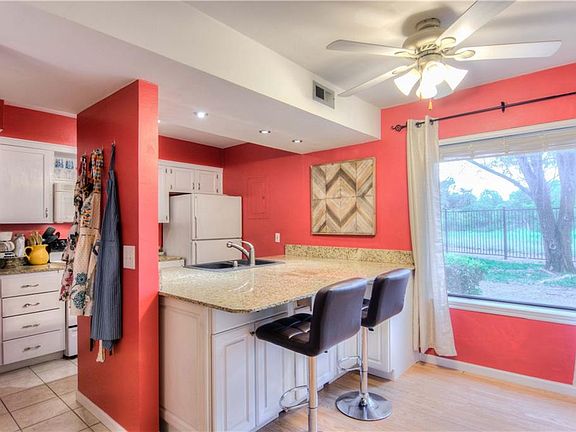 Updates, view, & charm all combine on this condo with great location in gated area. You'll love the feel and look of this home that offers views of OU golf course with large picture window, covered front porch, updated granite tops in the kitchen, open plan with fireplace in living room, this home is great for all seasons, you'll love the wood laminate floors throughout, both bedrooms have walk in closets, & full size utility room, walk-out balcony to enjoy the view. Great trees and peaceful setting for your enjoyment plus comes with refrigerator, full-size washer & dryer, only thing missing is YOU! Dues are $234/mo that covers everything but electric & internet, sign up fee to buyer of 3 months dues on all units