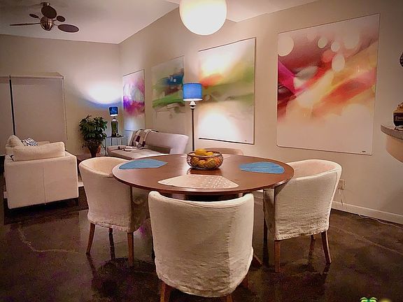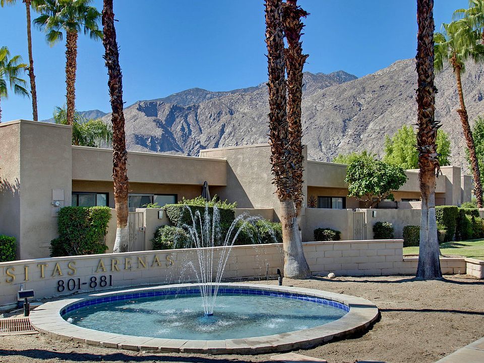 Casitas Arenas is a highly desirable quiet complex, that is rarely available, situated near Downtown Palm Springs greatest attractions such as Koffi, Starbucks, Sherman's, Regal Theatre, convention center, Casino, shops, restaurants and night life. This very charming updated, single story condo has great ceiling heights, 2 bedrooms, 2 baths, in approx 1176 sq ft, and has great separation between bedrooms,. Features include polished stained concrete floors throughout, and large private patio. Kitchen features plenty of cabinetry, granite and butcher block counters, and stainless appliances. The Great room provides for formal dining and a wet bar. Master has a walk-in closet and access to the large enclosed patio. Community pool and spa are in the center of the complex, with beautiful mountain views, giving the feeling that you are at a high end resort. Small development of 40 homes, perfect for full-time or a part time residence and you own the land.