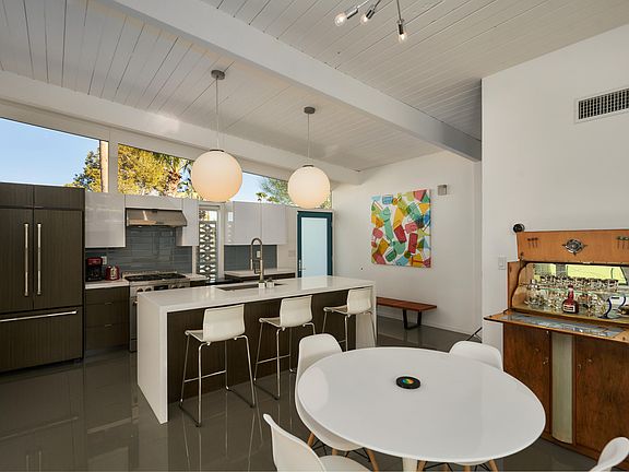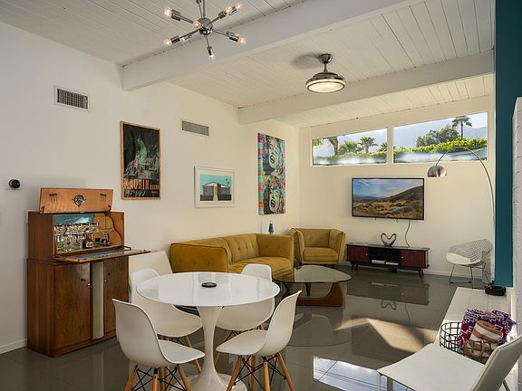 Welcome to 813 E Janet Circle where Mid Century meets Modern, this Krisel & Palmer FAIA designed home was built by the Alexander construction Co. This home has been fully renovated from the ground up at a cost of over $200K. This is not a flip home with an IKEA kitchen, you will appreciate the attention to detail throughout. You will love driving up to your home on a highly desirable quiet Cul-de-Sac location with Mt San Jacinto outlining the background. Walk through the front door to the open concept custom kitchen, with Designer Appliances/Waterfall Quartz island with built in Sink and Dishwasher/Custom cabinets/24x24 Porcelain tile throughout/Gas fireplace w/Block wall/clerestory windows/Dual pane windows/Custom baths master with extra oversized shower/Insulation foam roof/Tankless water heater/Nest thermostat/Salt water Pool-Jacuzzi/Fire pit/Carport/Breeze block/$4K Surveillance system/Alarm/ the complete renovation cost-sheets will be available at the time of showing. The W/D was brilliantly relocated out of the hallway to the courtyard closet, it has double doors & cabinets. Your master has a Million $$ view of Mt San Jacinto and your pool-Jacuzzi-fire pit. The entertainers yard layout allows for 4 large separate areas. This home is one of the finest examples of MCM in Palm Springs because of the quiet location, amazing view, and custom finishes. Most all of the furnishings are included which makes it turnkey, Fee land you own it. Please watch the VIDEO TOUR