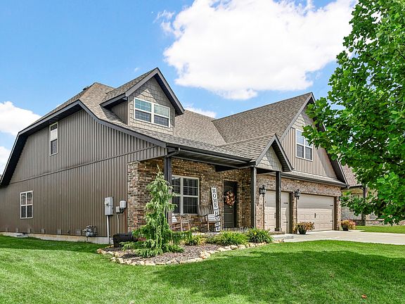 4 bedrooms in Nixa within walking distance of the Community Center! This wonderful home is located on a cul de sac in a neighborhood with sidewalks. The entry is a wonderful, roomy, long foyer that leads into the main living area. The open kitchen, dining & living room flow together nicely. The 10 ft ceilings create an open air feeling while being able to see the fireplace and back yard. The master & guest bedroom are on the 1st floor. along with the laundry and a 1/2 bath. Upstairs you find 2 more bedrooms, a full bath along with the bonus room and wet bar. Levolor white blinds are on the windows. This beautiful kitchen has granite, Kitchen Aid appliances, including a convection oven, a lazy susan, a pantry, & an island with a bar seating area. The under cabinet lighting is ''smart'' lighting. ''Hey google, turn on the lights.'' The garage doors are also Google smart. Outside is a lovely fenced yard, a garden area and a covered porch with ceiling fan. The attic has been partially floored for additional storage and is accessible from the upstairs bath. This 3 car garage home also features a dual furnace.