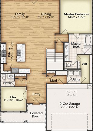 We were so excited about the new Briscoe home design that we chose to build it for our model home in Quail Run. This 2-story, 2,675-square-foot home is eye-catching from first look, and continues to please throughout the interior. The Briscoe weaves together Riverside Homebuilders' broad array of included features that would be considered upgrades by other builders?big details like granite countertops and wood floors, to important accents that include crown molding and a hall bench in the mudroom.The main floor presents an open concept in the center of the home, where the family living happens. The center island kitchen gives full view of the family and dining rooms. Meal prep is no longer an isolated activity. But when you want some separation, how about slipping away to your master suite, smartly located on the first floor? The private vestibule entrance gives you that cushion between life in general and your private time. The expansive bedroom leads to a master bath and walk-in closet that are both designed for sharing. We also made the laundry room accessible from your closet to avoid extra trips for this task. Finally, the first-floor flex room gives you one more reason the love the Briscoe floor plan. What will you do with one more space? The possibilities are endless