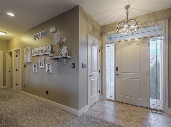 STUNNING Raised Ranch in beautiful Whispering Hills Estates. Custom/Quality built home with view of beautiful lake from 12 X 12 deck. Large corner lot with privacy fence. House has 1 owner. Gorgeous hardwood floors through kitchen/dining, custom birch cabinetry with pantry, gorgeous fireplace in great room, extra large walk in closet in master plus double vanity, shower & whirlpool including custom tile work, main level laundry. Finished walk out basement with beautiful custom built bar perfect for entertaining. Extra large FULL shower. TONS of unfinished space for storage.
