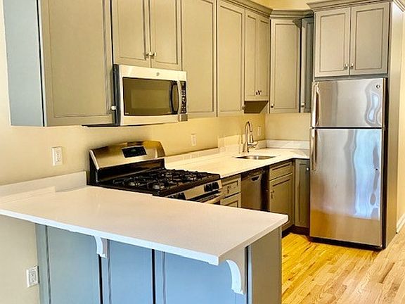 Renovated 2 bedroom/1 bathroom with great midtown location. Kitchen features custom cabinets, SS appliances and corian counter tops and breakfast bar. Bedrooms are on opposite sides of the unit. 2nd bedroom is smaller, but fits a full size bed. High ceilings and hardwood floors throughout. Laundry in the building and common backyard. Close to bus to NYC, light rail, parks, restaurants and shopping.