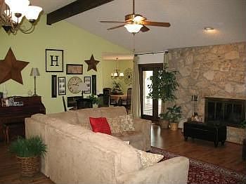 Wonderful Edmond neighborhood with community pool, park, rec field, 2 ponds, and tennis courts! Timber Ridge addition is located off Danforth between Boulevard and Bryant. Only minutes from schools, shopping, banks, grocery stores, hospital, restaurants, and movie theatre. This home has stone exterior on cul-de-sac lot with great curb appeal built 1977. Large front covered porch is accented with stone pavers and leads to entry with double doors. ?Welcome? is how you feel once you enter this home with approx. 2612 sq.ft., 3 bedrooms plus study, spacious living room, formal dining, 2 full baths, 1 half bath, and 2 car garage. Solid surface flooring throughout this home! Homeowner?s love the storage provided in their home along with nice size rooms. Updates within the last 4 years include: replaced all flooring with tile and wood laminate, kitchen redo with granite, tile, stainless steel appliances, & lighting, blinds installed, exterior and interior paint, deck bench seating, stone walkway on front porch, replaced all windows with Low E glass, French doors to both patios, and cable outlets in all rooms. Tile entry opens to large living room with wood laminate flooring, ceiling fan, beamed ceiling, stone fireplace, wood paneled wall and access to back deck. Study off living area has built-in desk, bookcase, and cabinet storage with ceiling fan and closet. Powder bath off entry. Master bedroom with private master suite: double vanities, bath tub, shower, built-in medicine cabinets, stained woodwork, and walk-in closet with built-ins. Bedrooms #2 and #3 are both spacious with ceiling fans, ample closet storage, built-ins, and access to hall bathroom. Utility room has tile flooring with drain under washing machine, built-in ironing board, and clothes rod. Kitchen supplied with tile flooring, stainless steel appliances, dishwasher, microwave, oven, electric smooth surface cook top, tile back splash, granite counter tops, built-in desk and island, eating area, and built-in