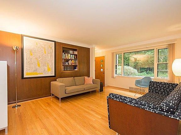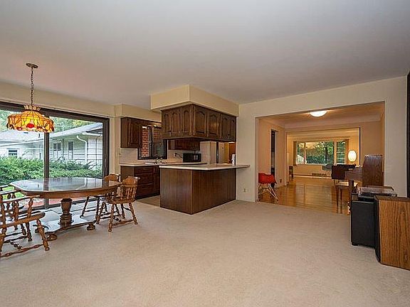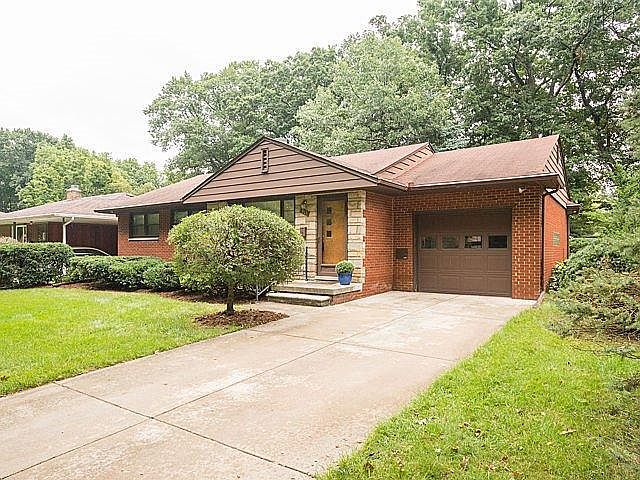 Immaculate mid-century brick and stone ranch on a quiet Westside street in an established neighborhood. 1440 s.f., 3 bedrooms, 2 baths, spacious kitchen, dining room, two fireplaces, attached garage, and finished basement, with mature landscaping and trees. Hardwood floors, slate foyer, generous closets. Coved ceilings, flush brick hearth, built-in recessed shelving, broad overhangs, and ceramic bath are just the beginnings of the terrific details and character of this home. Kitchen boasts quality wood cabinets, built-in desk, pantry, eating bar, & ample storage. Spacious 19' x 17' great room w/brick wall, fireplace, 8' doorwall to patio, & large windows overlooking private back yard & trees. Light-filled bedrooms have hardwood floors. Finished lower level family/rec room includes brick-fronted fireplace, knotty pine paneling, recessed lighting, & bar. Ample lower level utility/storage space as well. Wooded view of Fritz Park across the street; easy walking access to Eberwhite Woods.