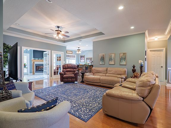 LOVELY TO LOOK AT,DELIGHTFUL TO LIVE IN. Inside you will find a large great room with trey ceiling , crown molding and formal dining room. The kitchen has lots gorgeous cabinets, Cambria composite counter tops, pop up mixer platform. with pull out drawers, walk in pantry, breakfast bar, double ovens and breakfast area. Extra large laundry room off kitchen with closet, room for freezer and cabinets. Double windows for natural lighting. Master bedroom features bay window, trey ceiling ,2 walk in closets, dual vanities, tile shower, jetted tub & make up area. 3 guest bedrooms all with great closet space. 2nd bath has tub shower combo. The Great room opens up to French doors inviting you into the sunroom with gas fireplace . Full bath with extra large walk in tile shower with grab bars, seat & roll under sink. All living areas have hardwood floors , baths, kitchen & laundry has tile. No carpeting. Step out of the sunroom and you are on the screened porch, perfect for enjoying the beautiful manicured fenced in backyard. Cook out on the shaded patio while enjoying the fruit trees and birds everywhere. Oversize side loading garage with workout bench. Circular drive in the front for extra parking. New roof.