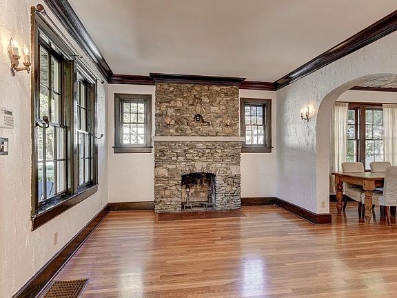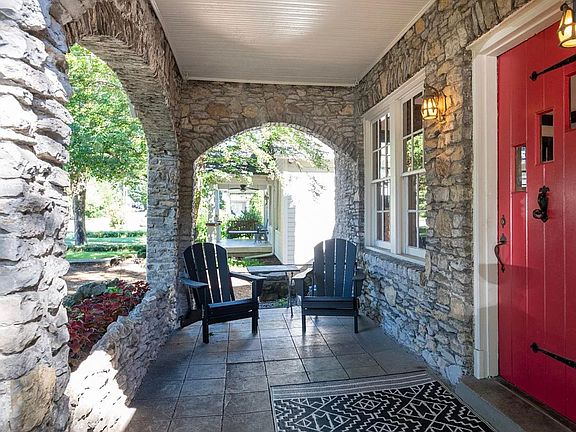 Historic stone cottage with vintage woodwork, vaulted ceilings in owner's suite and kitchen, stainless appliances, granite countertops, hardwood floors, garage, full height concrete basement. Includes historic Accessory Dwelling Unit studio apartment (606 SF) with vaulted ceilings, kitchen, laundry, bathroom, bedroom, and storage loft.