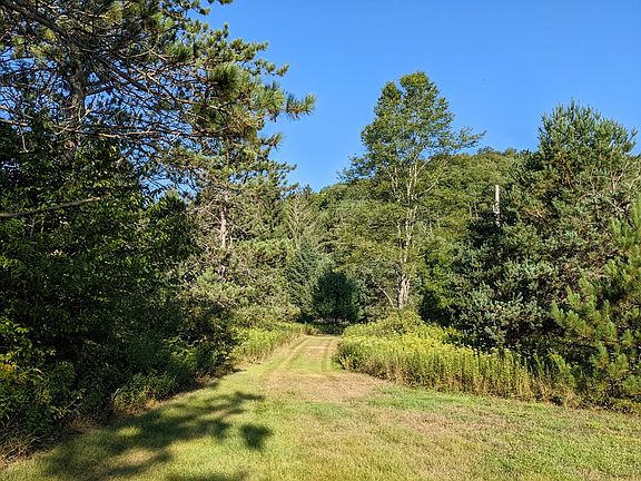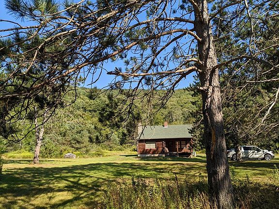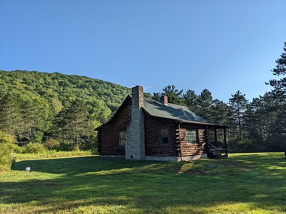 1,000 +/- feet of Pine Creek flows through this mostly level property with beautiful Potter County views. Near Lyman Run State Park, walk-in access to State Forest, close to Cherry Spring State Park for 'dark sky' viewing from the porch, and fun swimming hole. Attractive 1 & 1/2 story log cabin nestled in a private setting, eat-in kitchen, great room with a beautiful wood burning stone fireplace, 3 bedrooms, 3/4 bath, well, buried elec line, new roof in 2015, with septic system & leach field. A wood burning stove in a brick surround is centrally located (with vent holes) adding heat upstairs in addition to electric baseboard. Cell service, land line, 200 amp service, Tri-County Elec, & propane tank for range, with electric oven. The limestone chimney has a fresh air inlet on the outside. This is a must see for those who seek country living or vacation escape. Plenty of room for your family and friends to tent or pull in an RV and enjoy the quiet woodlands, including apple trees.