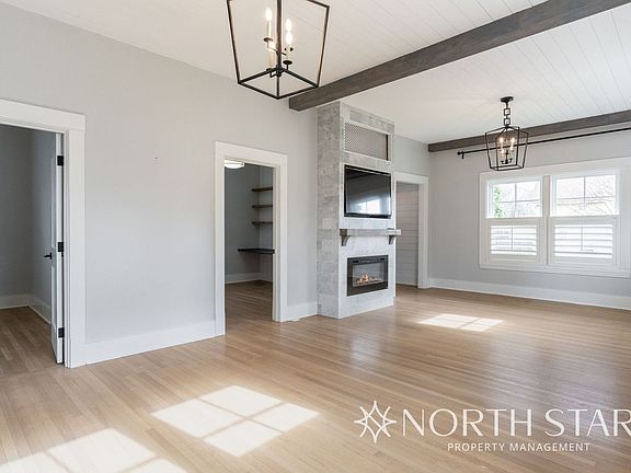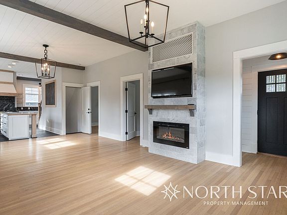 As you enter this thoughtfully designed home, you are greeted by the lovely light and bright space. The main living area is an open concept design encompassing the living/ dining room and kitchen. This lovely space features warm hardwood floors, a beautiful gas fireplace with built in TV, designer lighting, shiplap and wood beam ceilings, custom cabinetry, center island, granite and marble counters and back splash, stainless steel appliances and tile flooring. The main level also features 2 charming bedrooms and a gorgeous full bathroom with wash and dryer conveniently included.