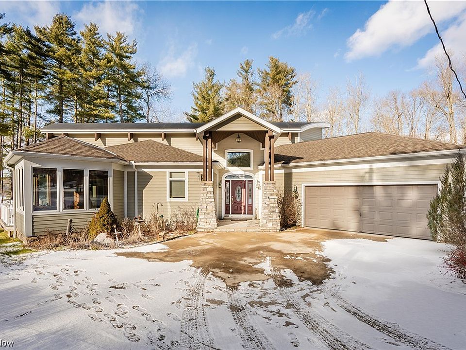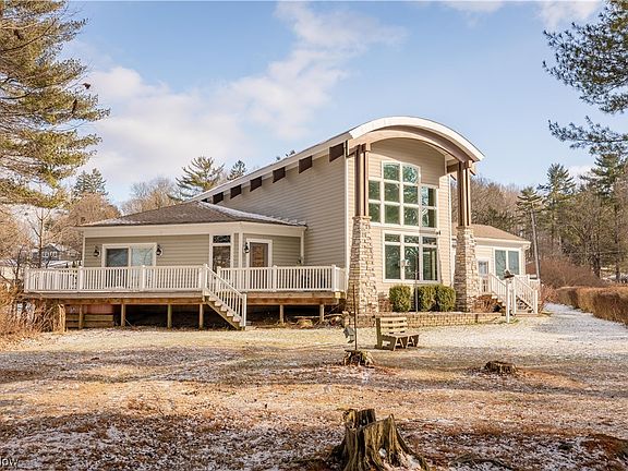 Don't miss this rare opportunity to own a spectacular lakefront home on private land at Atwood Lake...no lease to pay! This home was designed and built to maximize the lake views from every angle of the home. As you step into the home, you're greeted with a 2-story foyer that leads to the chef's kitchen with center island, granite counters, hardwood floors, abundance of cabinets, and an eating area that has windows overlooking the view of the lake. Adjacent to the kitchen/dining area is a fabulous 2-story living room with a wall of windows, unique wood barrel-type ceiling with a loft area, and corner gas fireplace. Upstairs you'll enjoy beautiful views of the lake from the loft with cherry floors, a second bedroom, and full bath. The first floor master bedroom boasts sliders to the deck overlooking the lake, walk-in closet, and double pocket doors that lead to a library with a gas in-wall fireplace. The master bath features a jetted tub, step-in shower, and double sinks. There's a room with a window to the living room that could have multiple uses including an area for serving to the living room, a craft room, or an office. In the warm weather, the enclosed 3-season sunroom is where you'll love enjoying the lake views. The laundry room is conveniently located near the master bedroom and there's a half bath nearby for guests. There's an oversized 2-car garage with steps to the basement which is partially crawl space and a large basement area. Outside are multiple decks overlooking the lake and a dock for boating enjoyment. Please Note that there is also a .43 acre lake view lot (parcel #23-0000409.000) with a 32x42 garage on it available ad an additional price of $100,000. Garage is wired but no electric or box installed yet.
